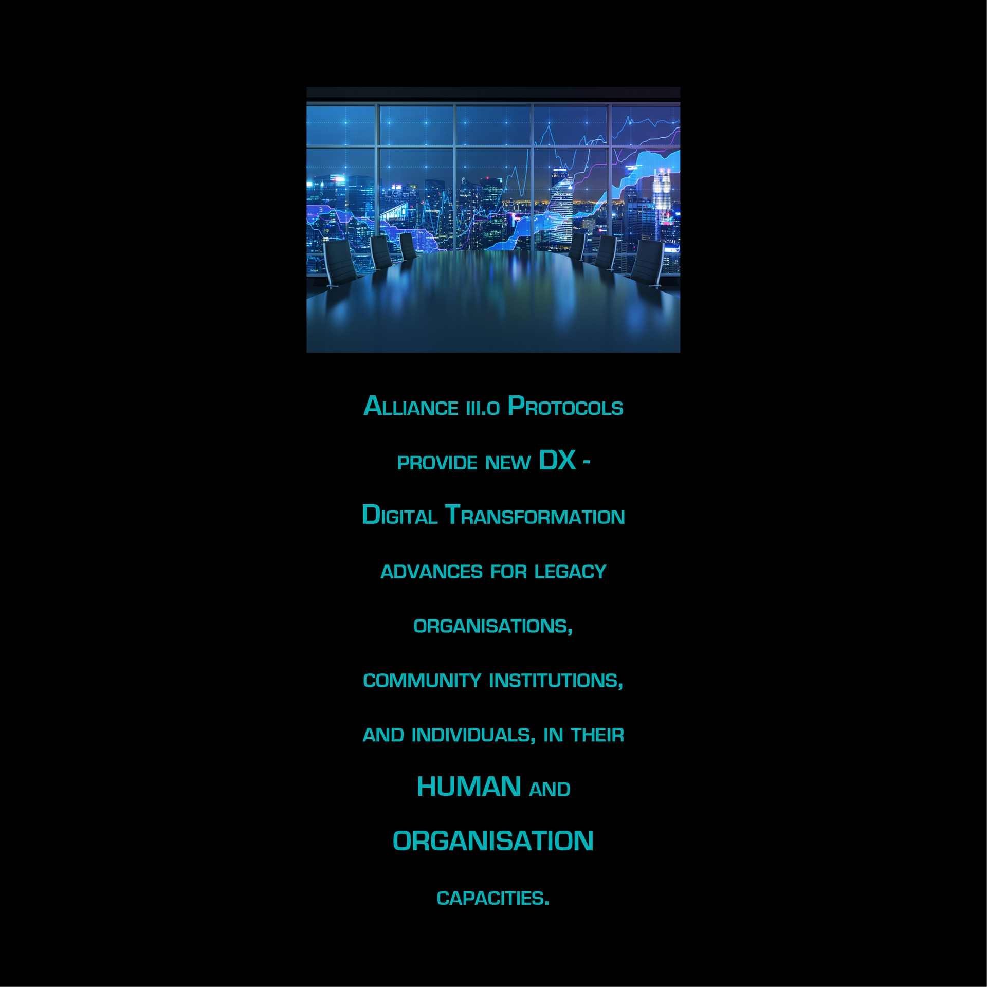 Connectivity: Ecosystems are interconnected through a global IT|IP|AI Protocol called Alliance iii.o, which provides governance and operational protocols for diversified interconnect IPv6 networks, supporting the underlying connectivity of Initiatives and Ecosystems.